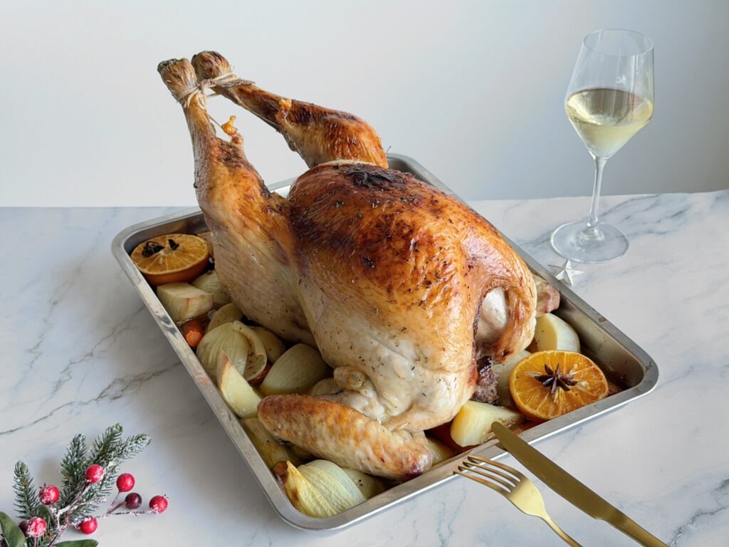 - Preparamos una bandeja con AOVE, patatas, zanahorias, puerro, cebollas, ajos, naranjas y anís (todo troceado). Salpimentamos y colocamos encima el pavo con las patitas atadas.